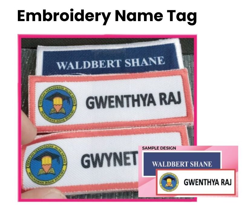 Lead Time: 1.5 weeks Size: 3 cm x 9 cm Logo & Name Print On Name Tag Sisi: Embroidery All Side